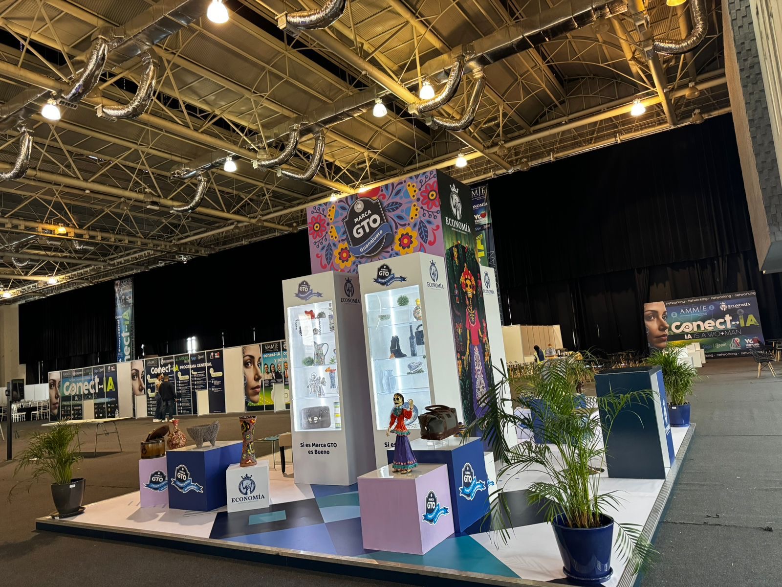 Stand modular diseñado para destacar la riqueza cultural y productiva de Guanajuato, integrando elementos tradicionales con tecnología moderna.